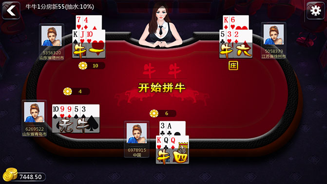 下注后系统开始自动发牌,发牌后玩家就要找出牌中的牛牌,将其摆好。然后点击“摆牛”按钮确认已摆好牛,然后点击“开牌”按钮确定比牌。